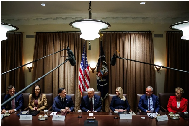 Tổng thống Mỹ Donald Trump (giữa) và các quan chức hàng đầu tại cuộc họp nội các tại Nhà Trắng hôm 24-3. Ảnh: BLOOMBERG