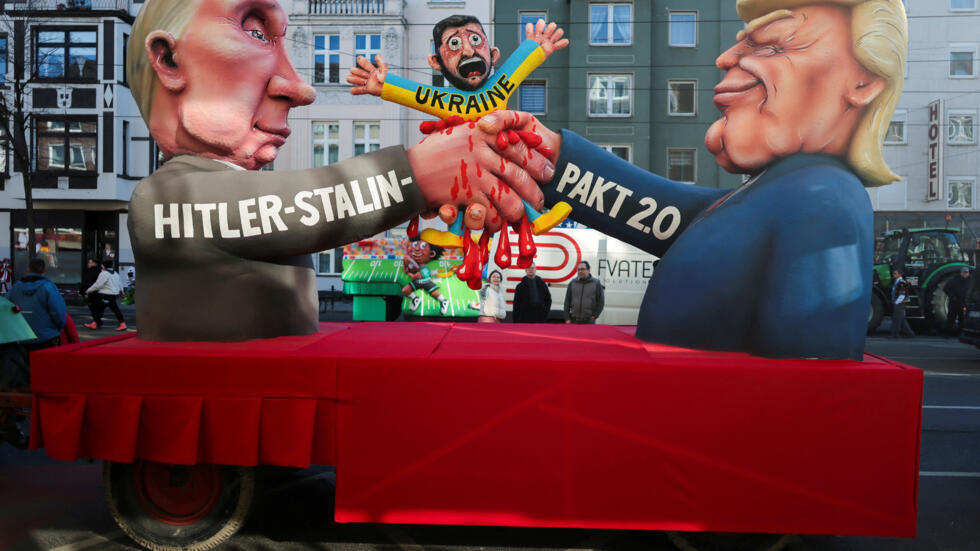 Ảnh minh họa : Một xe hoa trong lễ hội truyền thống « Rosenmontag » ở Düsseldorf (Đức) với hình tượng tổng thống Nga Vladimir Putin, tổng thống Ukraina Volodymyr Zelensky và tổng thống Mỹ Donald Trump, ngày 03/03/2025. REUTERS - Wolfgang Rattay
