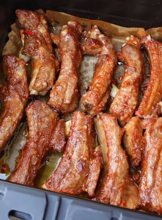 Nướng bằng nồi chiên không dầu: Đặt sườn vào nồi chiên không dầu, nướng ở 180°C trong 15 phút, sau đó lật mặt và nướng tiếp 5–10 phút.