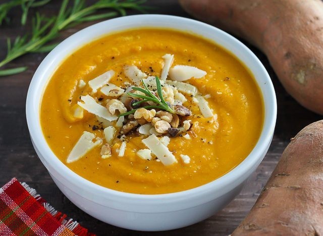 Để nấu món súp này, hãy xào hành và tỏi, sau đó thêm khoai lang cắt khối, nước luộc rau, nước cốt dừa. Đun nhỏ lửa cho đến khi khoai tây mềm, trộn đều và thêm quế để tăng thêm độ ấm.