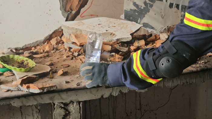 Đại úy Nam cho biết, việc đặt các chai nước tại hiện trường trong quá trình làm nhiệm vụ cưa cắt khối bê tông có thể đánh giá được mức độ nghiêng, rung lắc của công trình và xem dư chấn có ảnh hưởng đến toàn bộ kết cấu công trình hay không, từ đó rút ra được kinh nghiệm cũng như phương pháp phù hợp.