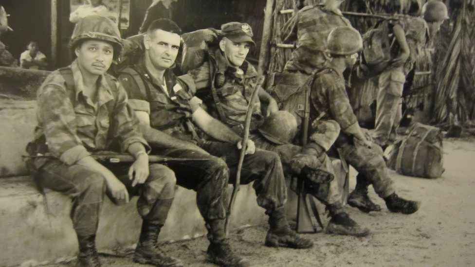 Đại úy Cố vấn Mỹ Norman Schwarzkopf đang dìu một thương binh Nhảy dù VNCH. (BL)
