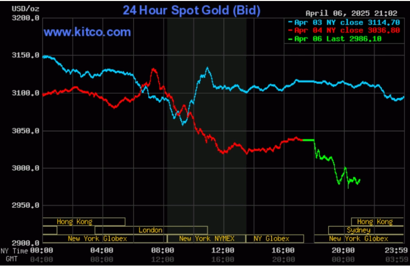 Sáng 7/4, giá vàng thế giới mất mốc 3.000 USD một ounce, trong khi chỉ số Nikkei 225 (Nhật Bản) giảm tới 8%.