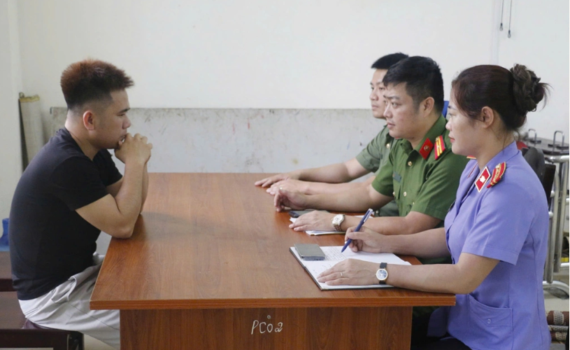 Nghi can Giáp (góc trái), tại cơ quan điều tra. Ảnh: Hòa Vang