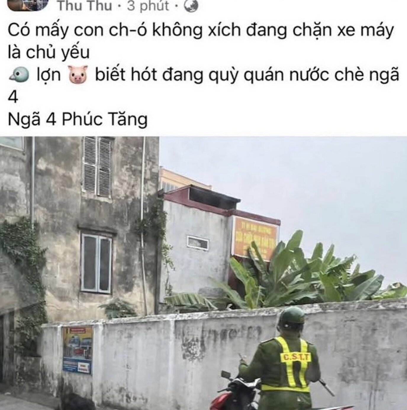 Trong khi đó, mạng xã hội rò rỉ ảnh chụp màn hình cho thấy bài đăng của ông S. trong nhóm Facebook “Giao Thông Hải Phòng” với nội dung: “Có mấy con chó không xích đang chặn xe máy là chủ yếu. Chim lợn biết hót đang quỳ ở quán nước chè ngã tư Phúc Tăng” kèm hình ảnh một cảnh sát giao thông đậu xe gắn máy cạnh một con chó.