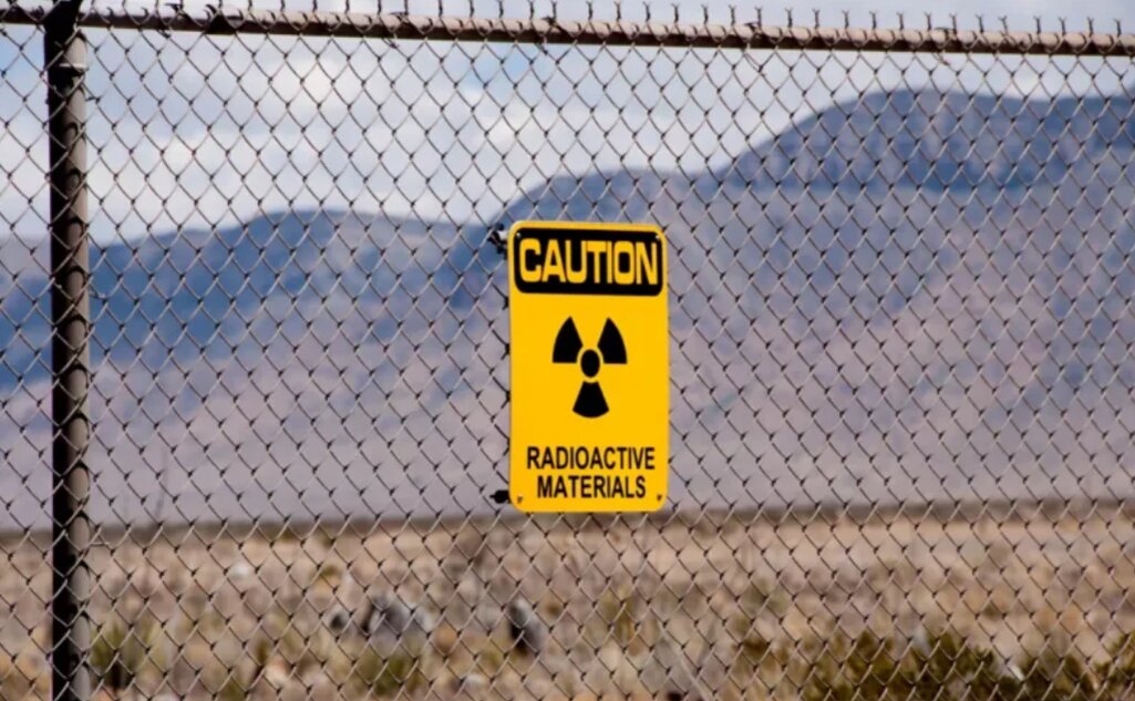 Biển báo cảnh báo về vật liệu phóng xạ được dựng lên tại Bãi thử tên lửa White Sands sau vụ nổ quả bom nguyên tử đầu tiên trên thế giới ở Socorro, New Mexico. Ảnh Getty