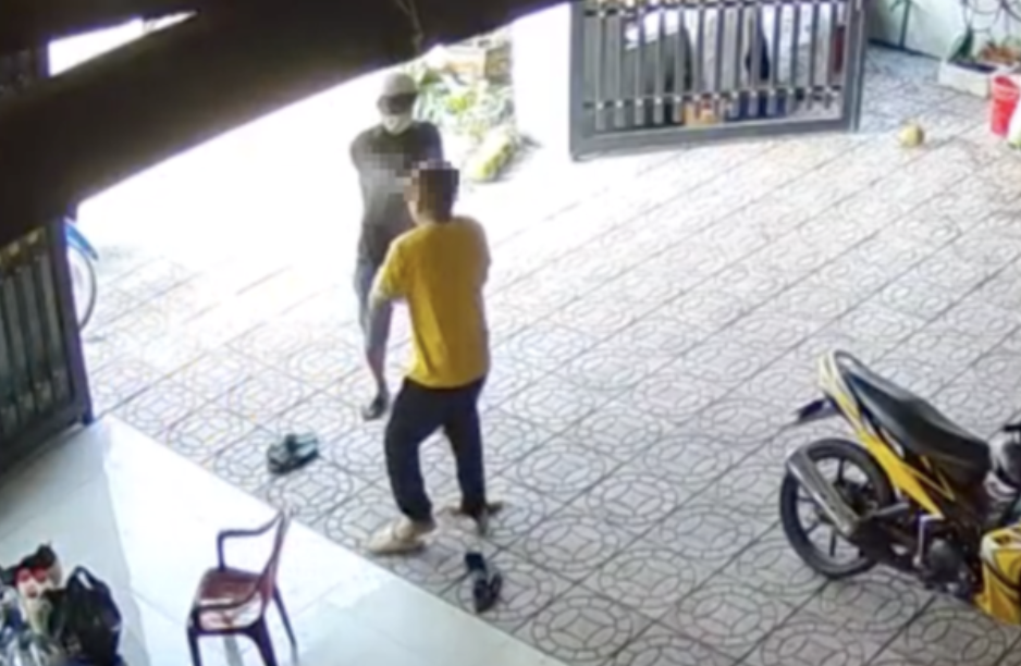 Ông P. (đội nón) bắn ông T. vào sáng 28-4. Ảnh trích xuất từ camera