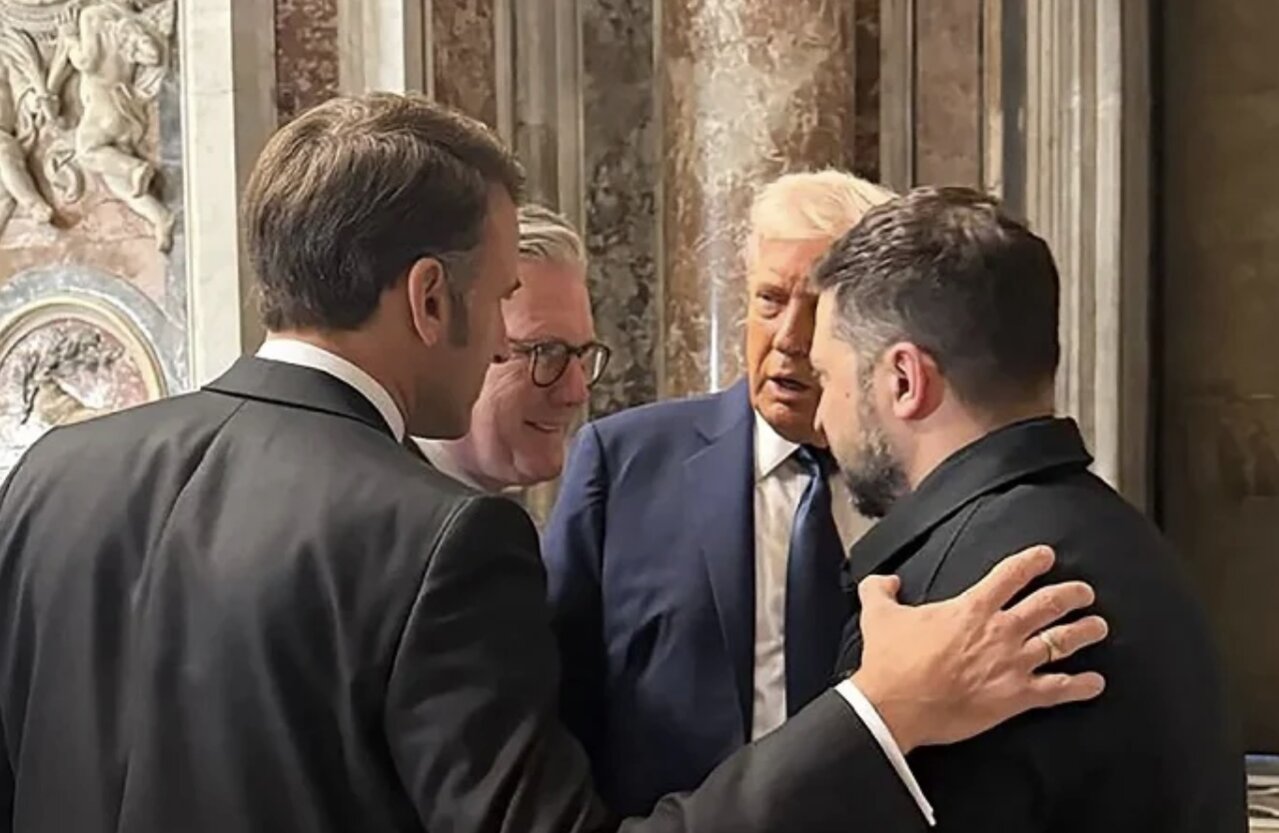 Tổng thống Volodymyr Zelensky gặp Tổng thống Pháp Emmanuel Macron, Thủ tướng Anh Keir Starmer và Tổng thống Mỹ Donald Trump trong lễ tang của Giáo hoàng Francis vào ngày 26/4/2025 tại Vatican. Ảnh Getty Images