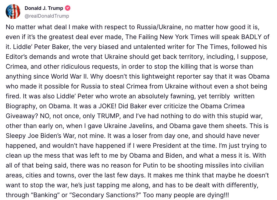 “Không có lư do ǵ để ông Putin bắn tên lửa vào các khu vực dân sự, thành phố và thị trấn trong vài ngày qua. Điều đó khiến tôi nghĩ rằng có lẽ ông ta không muốn chấm dứt chiến tranh, mà chỉ đang lợi dụng tôi, và cần phải bị xử lư theo cách khác, thông qua ‘trừng phạt ngân hàng’ hoặc ‘trừng phạt thứ cấp'? Quá nhiều người đang chết!!!”, ông Trump tuyên bố.