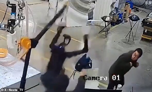 Con robot này liên tục vung tay mạnh lên trời, lao về phía một người ngồi gần đó như muốn tấn công. Hành động bất ngờ của con robot khiến người đàn ông phải bỏ chạy, giơ tay che mặt để phòng thủ.