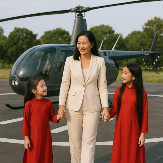 Từ trong trực thăng bước ra là một người phụ nữ thanh lịch trong bộ áo dài trắng tinh, mái tóc dài, tay dắt theo hai bé gái xinh như thiên thần.