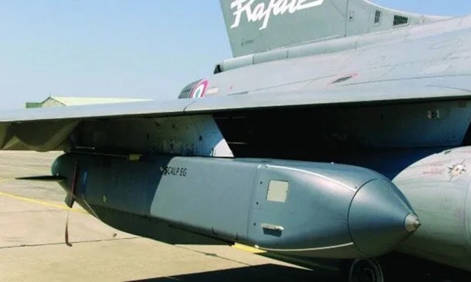 Tên lửa SCALP-EG treo dưới cánh tiêm kích Rafale. Ảnh: MBDA