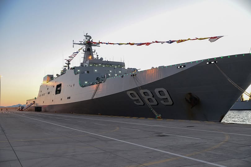 Tàu chiến đa năng Trường Bạch Sơn lớp Type-071 (số 989) của Quân Giải phóng Nhân dân Trung Quốc (PLA) đã cập bến Căn cứ Hải quân Ream ở Sihanoukville, Campuchia hôm 12/5 để tham gia cuộc tập trận quân sự chung Campuchia-Trung Quốc có tên “Rồng Vàng 2025” diễn ra từ ngày 14-28/5, theo Khmer Times.