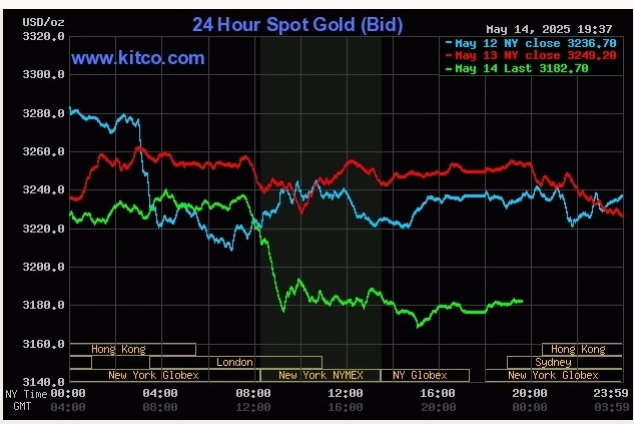 Chốt phiên giao dịch 14/5, giá vàng thế giới giao ngay giảm 73 USD xuống 3.176 USD một ounce. Sang phiên sáng 15/5, giá tăng nhẹ lên 3.182 USD một ounce, nhưng vẫn là thấp nhất kể từ phiên 11/4.