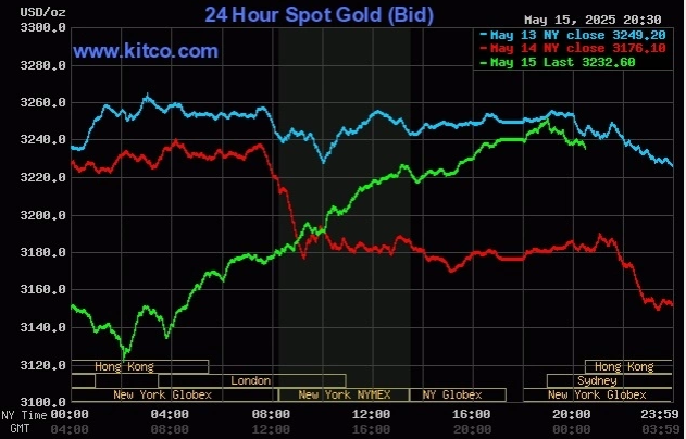 Chốt phiên giao dịch 15/5, giá vàng thế giới giao ngay tăng 63 USD một ounce, lên 3.239 USD. Mở cửa phiên sáng 16/5, giá vẫn quanh mốc này.