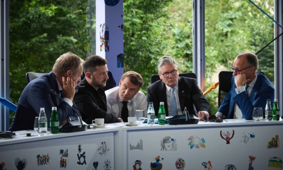 Từ trái sang phải: Thủ tướng Ba Lan Donald Tusk, Tổng thống Ukraine Volodymyr Zelensky, Tổng thống Pháp Emmanuel Macron, Thủ tướng Anh Keir Starmer và Thủ tướng Đức Friedrich Merz ngày 16/5 tại Albania. Ảnh: Telegram/ZelenskiyOfficial
