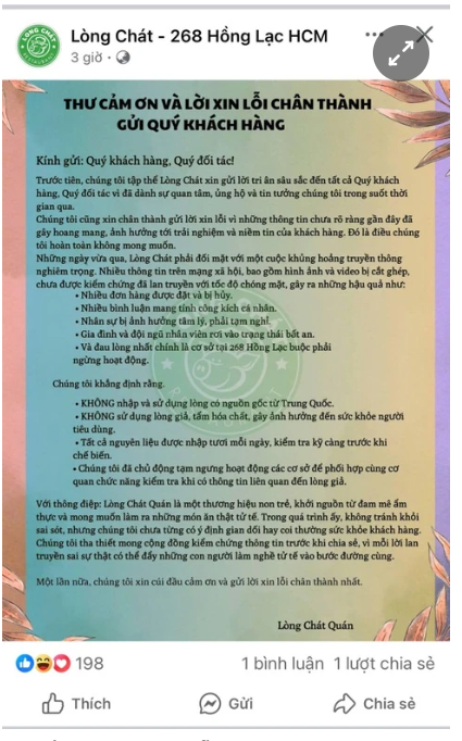 Sáng 23/5, fanpage “Lòng Chát - 268 Hồng Lạc HCM” đăng tải thư cảm ơn và xin lỗi khách hàng sau chuỗi ngày bị “khủng hoảng truyền thông nghiêm trọng”.