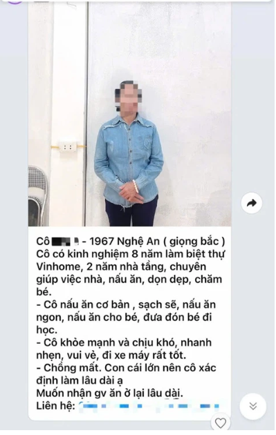 Theo lời giới thiệu từ công ty môi giới, bà O. - người Nghệ An (nói giọng Bắc). “Cô có kinh nghiệm 8 năm làm tại biệt thự Vinhomes, 2 năm làm nhà tầng, chuyên giúp việc nhà, nấu ăn, dọn dẹp, chăm bé. Cô sạch sẽ, nấu ăn ngon, khoẻ mạnh, chịu khó…”.