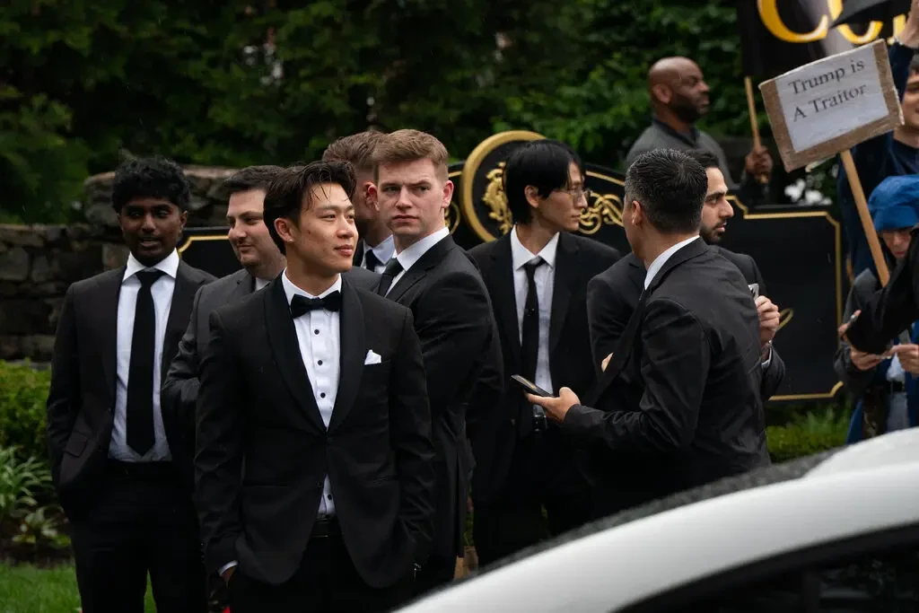Bữa tiệc của ông Trump đă không diễn ra suôn sẻ. Bên ngoài Câu lạc bộ Golf, hàng chục người biểu t́nh đă tập trung, hô vang những khẩu hiệu phản đối mạnh mẽ. Khi các khách mời tiến vào, họ bị chào đón bằng tiếng hô "đáng xấu hổ" không ngớt.