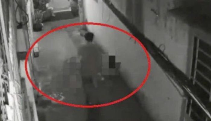 Hình ảnh C. khiêng thi thể mẹ ra ngoài đường được camera ghi lại.