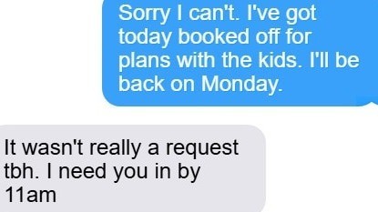 Theo đó, một nữ nhân viên đang trong thời gian nghỉ phép có kế hoạch cùng các con thì bất ngờ nhận được tin nhắn từ cấp trên yêu cầu tham dự một buổi thuyết trình thay cho đồng nghiệp vắng mặt. Khi cô từ chối vì lý do cá nhân, sếp lập tức phản hồi gay gắt: “Thật ra đây không phải là một yêu cầu. Tôi cần cô có mặt lúc 11h.”