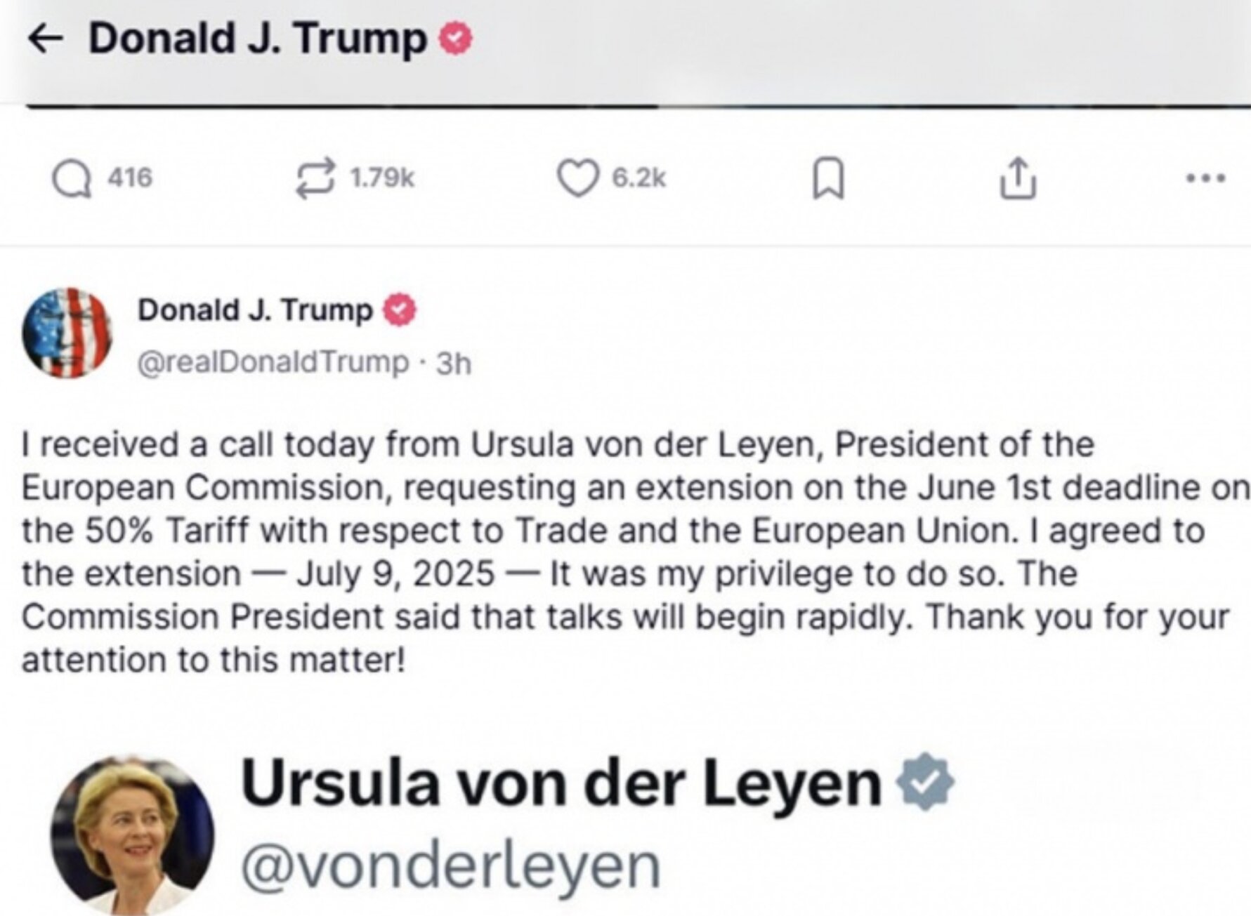 Trên mạng xã hội Truth Social, ông viết: “Hôm nay tôi nhận được cuộc gọi từ Ursula von der Leyen, Chủ tịch Ủy ban châu Âu (EC), yêu cầu gia hạn thời hạn 1/6 cho thuế quan 50% đối với thương mại và EU. Tôi đã đồng ý gia hạn tới ngày 9/7. Tôi rất vinh dự khi được làm như vậy. Chủ tịch Ủy ban cho biết các cuộc đàm phán sẽ bắt đầu nhanh chóng. Cảm ơn sự quan tâm của các bạn đối với vấn đề này!”.