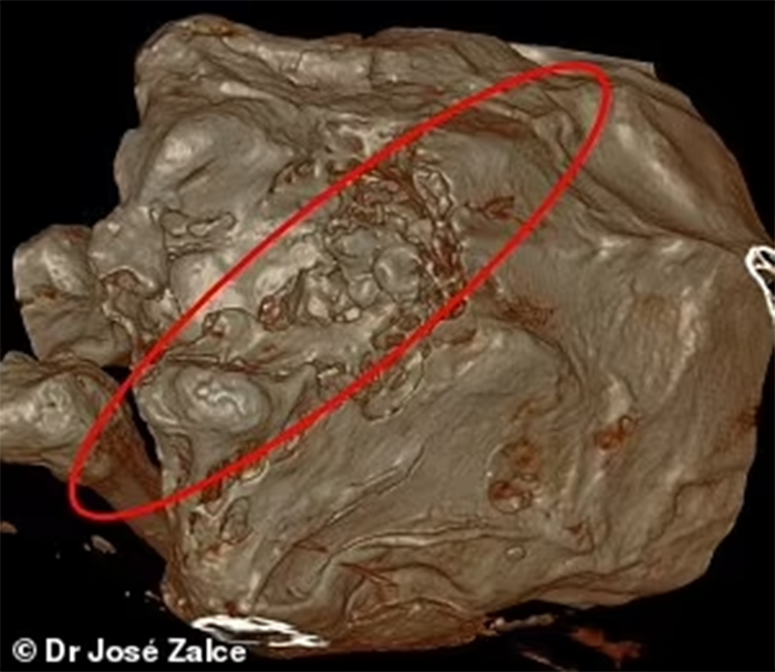 Hình ảnh CT scan của một mẫu vật có tên Maria cho thấy có vết cắn, xương gãy, tụ máu trong mô, và dấu hiệu tổn thương bên trong. Ảnh: José Zalce/DailyMail