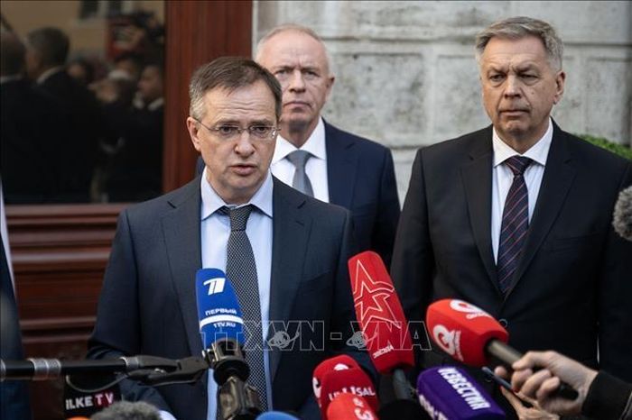Ông Vladimir Medinsky trong cuộc họp báo tại Istanbul (Thổ Nhĩ Kỳ) ngày 15/3/2025. Ảnh: AA/TTXVN