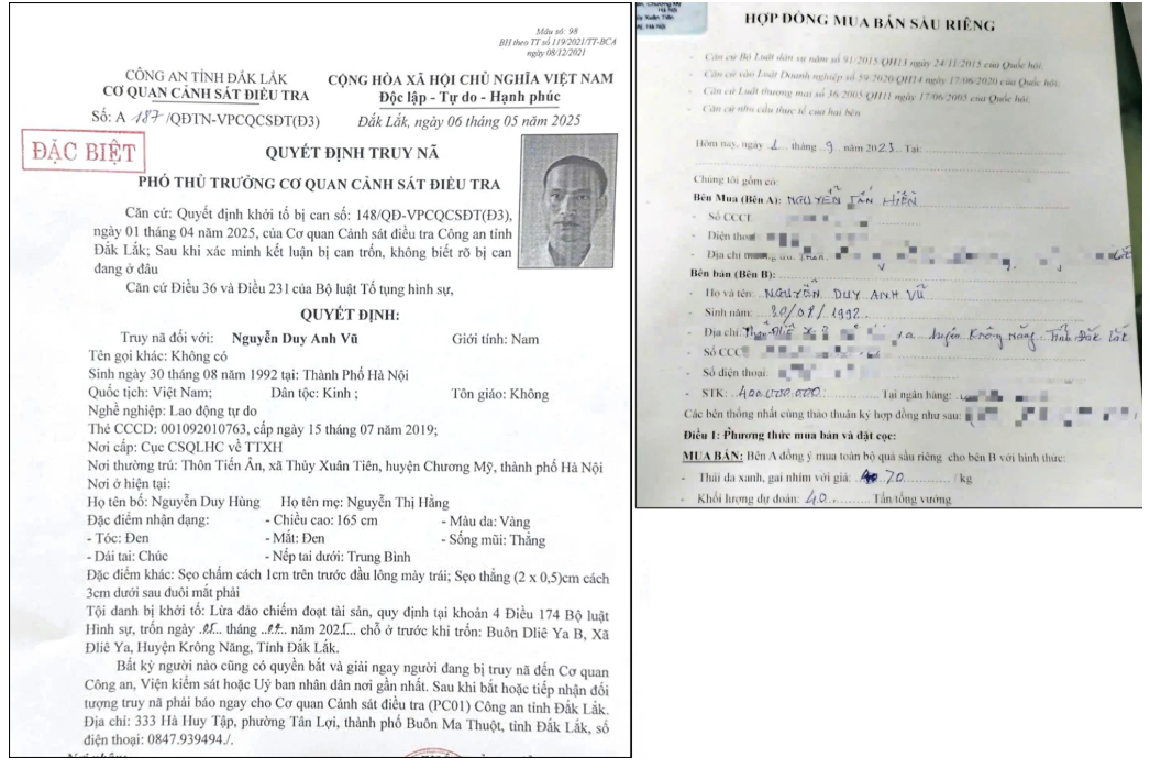 Quyết định truy nã đối với Nguyễn Duy Anh Vũ và hợp đồng mua bán sầu riêng mà Vũ đã lừa nhiều thương lái tại Đắk Lắk.
