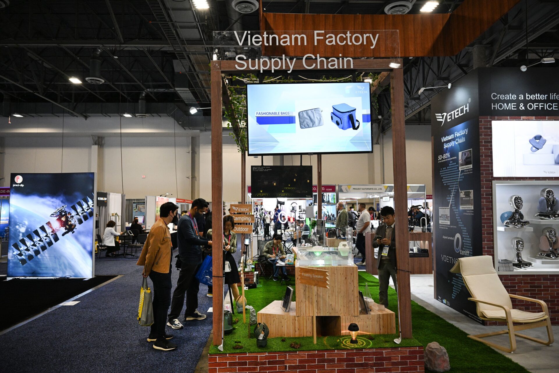 Gian hàng triển lăm thương mại của VN ở Las Vegas, Nevada, trưng bày hồi đầu năm 2023 quảng cáo một số hàng điện tử trong chuỗi sản xuất tại VN xuất cảng, khi hàng loạt công ty chạy từ TQ đến VN để tránh mức thuế trừng phạt của Hoa Kỳ. (Ảnh: Robyn Beck/AFP/Getty Images)