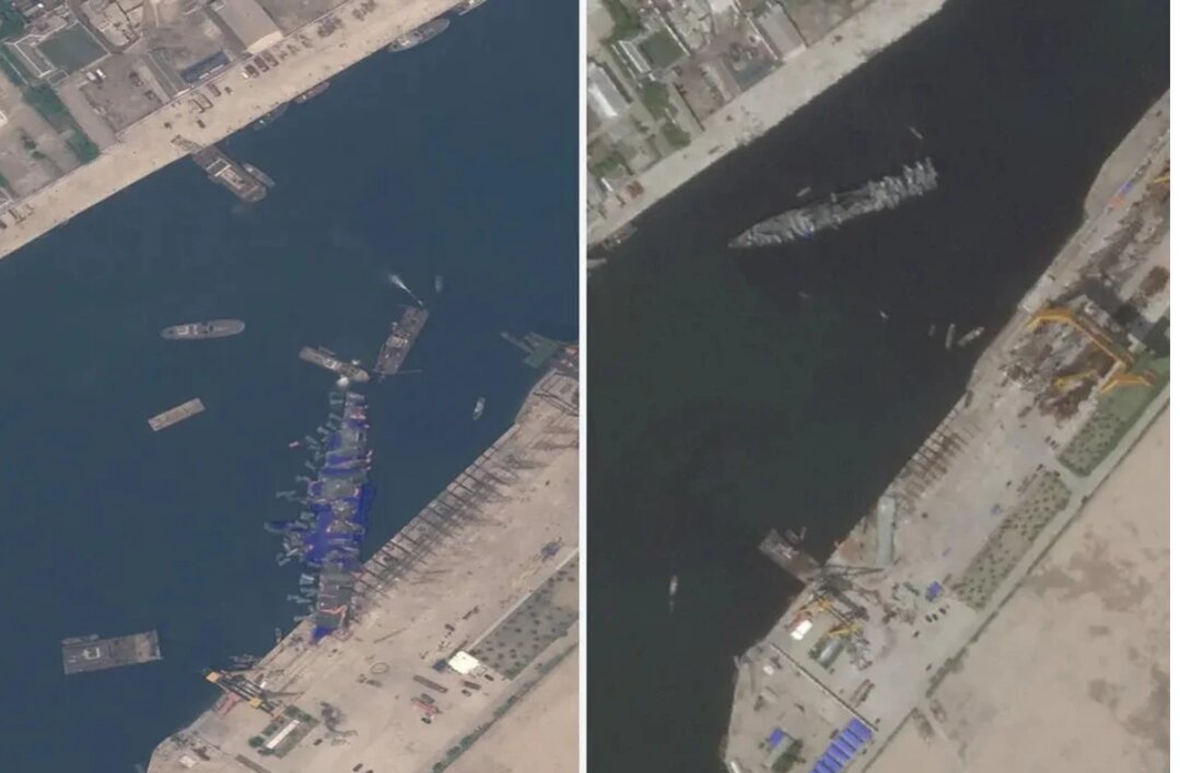 Ảnh vệ tinh chụp ngày 29/5 cho thấy hàng trăm người đứng dọc bến cảng, bên cạnh các hàng dây cáp dường như nối với con tàu.
