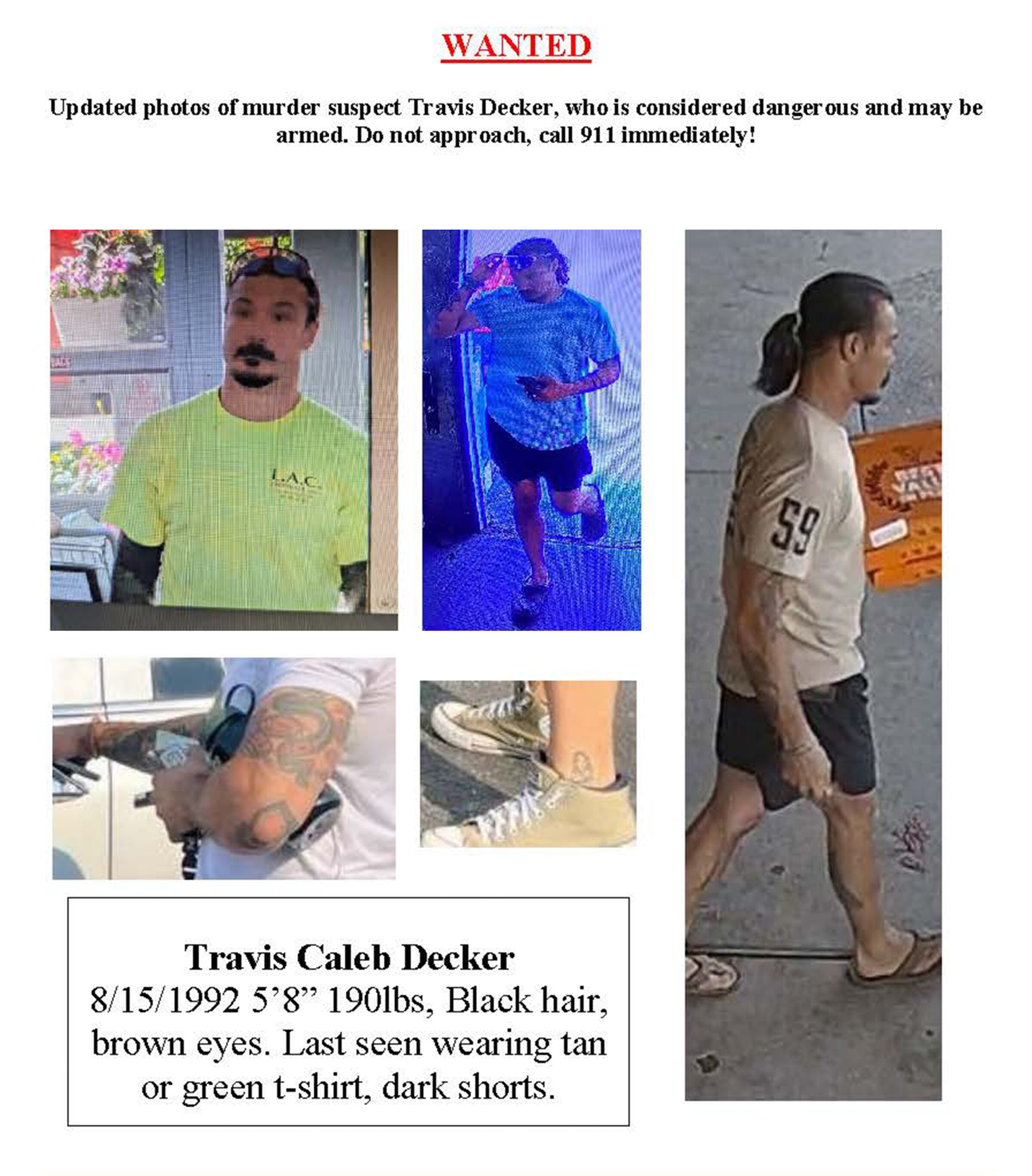 Văn phòng cảnh sát trưởng có cho phát hành các bức ảnh mới của tên Decker này cho thấy hình xăm và mái tóc đặc biệt của anh ta theo kiểu đuôi ngựa, cũng như loại quần áo được nhìn thấy lần cuối khi đang mặc.