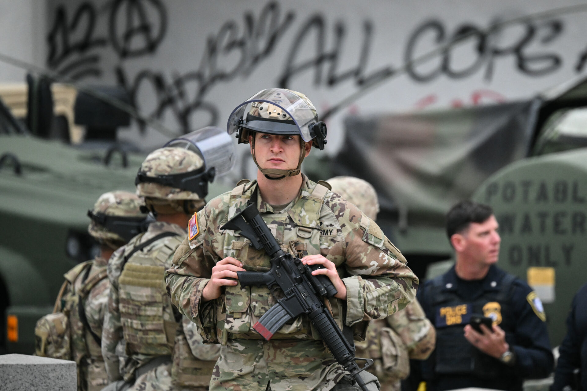 Vệ Binh Quốc Gia đứng gác trước tòa nhà liên bang Edward R. Roybal Federal Building ở Los Angeles, California, hôm thứ Ba, 10/6, sau một ngày nữa đã xảy ra biểu tình dữ dội phản đối chiến dịch vây bắt di dân lậu của các nhân viên đặc vụ liên bang ở thành phố này. (Ảnh: Ronaldo Schemidt/AFP via Getty Images)