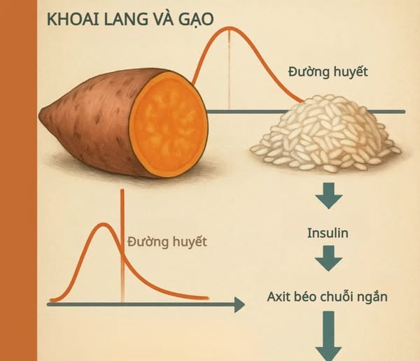 Ngược lại, khoai lang chứa tinh bột kháng + tinh bột tiêu hóa chậm, GI từ 44–61 tùy loại (trung bình – thấp) → đường huyết tăng từ từ, không gây sốc đường.