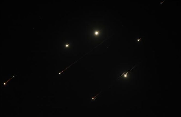 Các vệt sáng trên bầu trời thành phố Nablus, Bờ Tây khi Iran phóng tên lửa vào lãnh thổ Israel tối 14/6/2025. Ảnh: THX/TTXVN