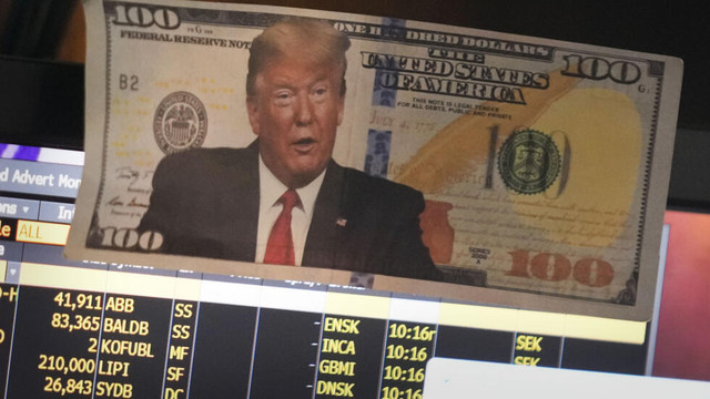 (Ảnh ghép) Hình ảnh tổng thống Mỹ Donald Trump trên tờ một trăm đô la tại một bài đăng trên sàn của Sở giao dịch chứng khoán New York ở New York, Mỹ, ngày 21 tháng 1 năm 2025. AP - Seth Wenig