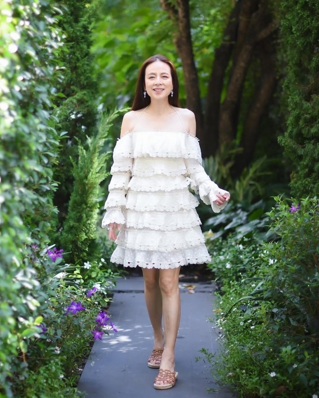 Vóc dáng cân đối giúp Chủ tịch Liên đoàn Bóng đá Thái Lan dễ dàng diện nhiều kiểu váy. Theo Siamsport, tủ đồ của bà có nhiều váy trễ vai, váy không tay chữ A, váy cổ yếm, váy tay bồng.
