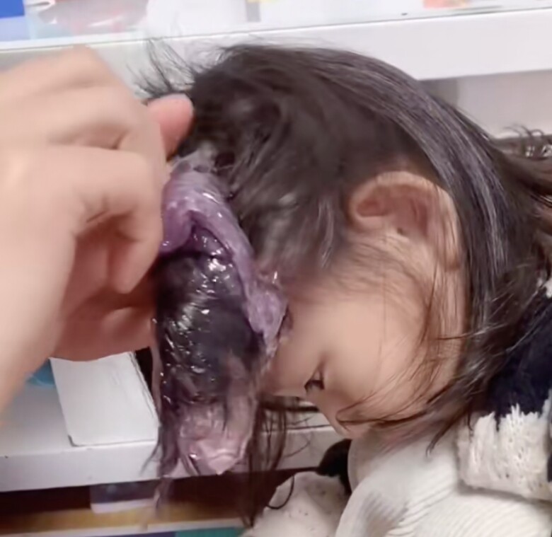 Tuy nhiên, loay hết hết 1 tiếng đồng hồ, người mẹ vẫn không thể loại bỏ thứ chất lỏng dính trên đầu con. Sợ làm không đúng có thể khiến đầu tóc con bị thương, chị quyết định đưa con đến bệnh viện để nhờ các bác sĩ đưa ra hướng loại bỏ vật thể này. Nhờ sự hỗ trợ từ bác sĩ, y tá mà con gái chị đã “bình thường” trở lại như trước.