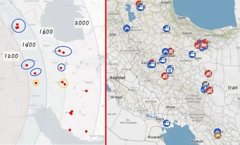 Trên bản đồ các vụ không kích của Israel cho thấy, các căn cứ tên lửa của Iran được đánh dấu màu đỏ, những căn cứ đã bị phá hủy hoặc bị vô hiệu hóa được đánh dấu màu xanh (7 căn cứ) và hiện tại Israel đang tiến hành tấn công vào những căn cứ được khoanh màu vàng (3 căn cứ).