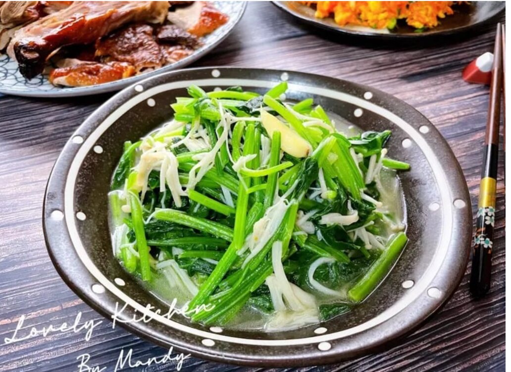 Lưu ý: Thêm chút đường sẽ giúp cải bó xôi bớt vị chát, còn nấm kim châm thì tăng độ giòn ngon khi nhai.