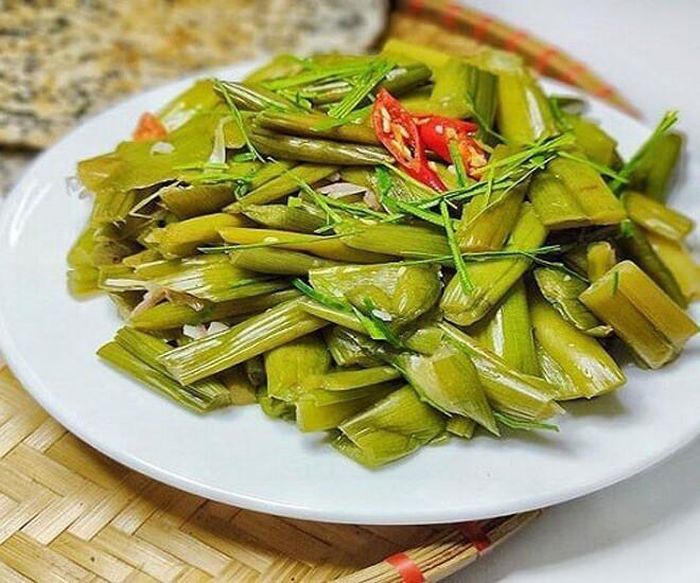 Nguyên liệu: Dọc mùng, thịt bò hoặc tôm, tỏi, hành lá, gia vị.