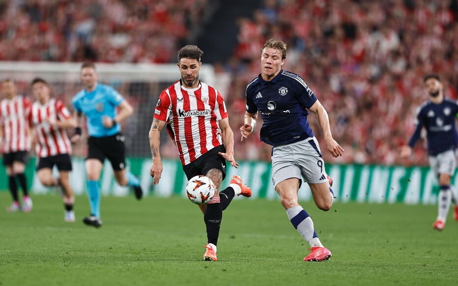 Yeray Alvarez đua tốc độ với Rasmus Hojlund (số 9) trong trận bán kết lượt đi Europa League ngày 1/5. Ảnh: AFP