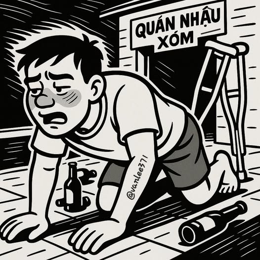 - "Anh Minh chủ quán gọi điện báo anh nhậu xong bỏ quên cặp nạng ở quán. Thiệt hết nói nổi, mấy tuần trước nhậu té xe gãy chân chưa kịp lành, nay lại tiếp tục nhậu. Mà anh cũng hay thiệt, có thể bò từ quán về nhà gần 2 cây số ..."