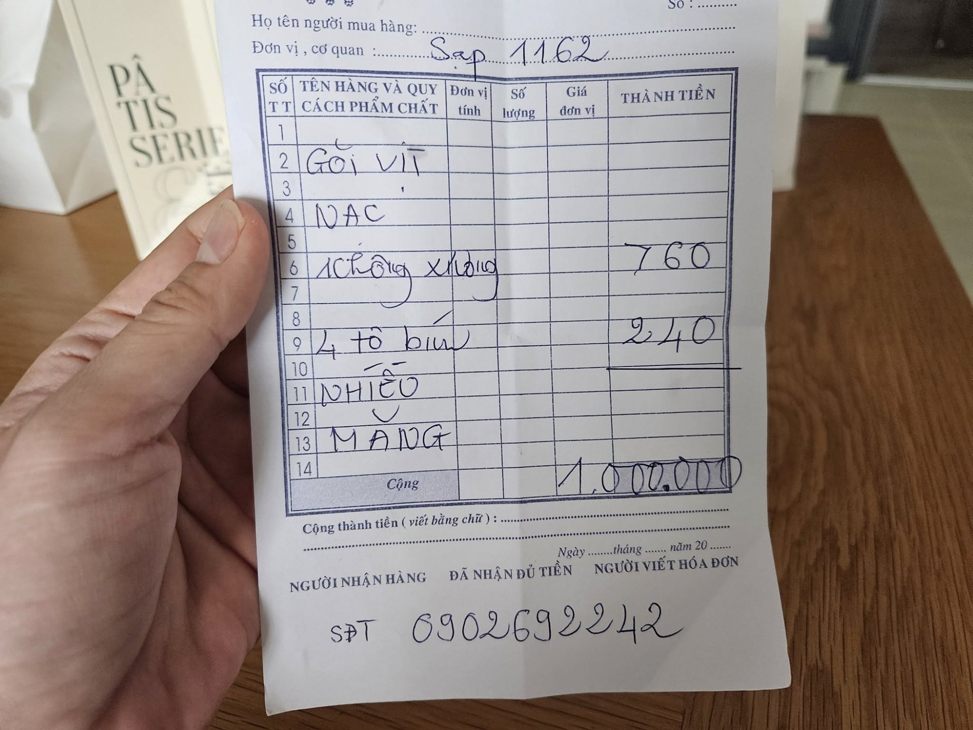Hóa đơn viết tay phần ăn 1 triệu đồng. Ảnh: NVCC