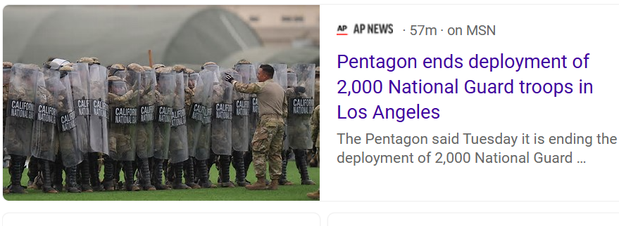 LOS ANGELES (AP) — Lầu Năm Góc hôm thứ Ba cho biết họ sẽ chấm dứt việc triển khai 2.000 lính Vệ binh Quốc gia tại Los Angeles, chiếm gần một nửa số binh sĩ được điều đến thành phố này để đối phó với các cuộc biểu tình phản đối chính sách siết chặt nhập cư của chính quyền Trump.