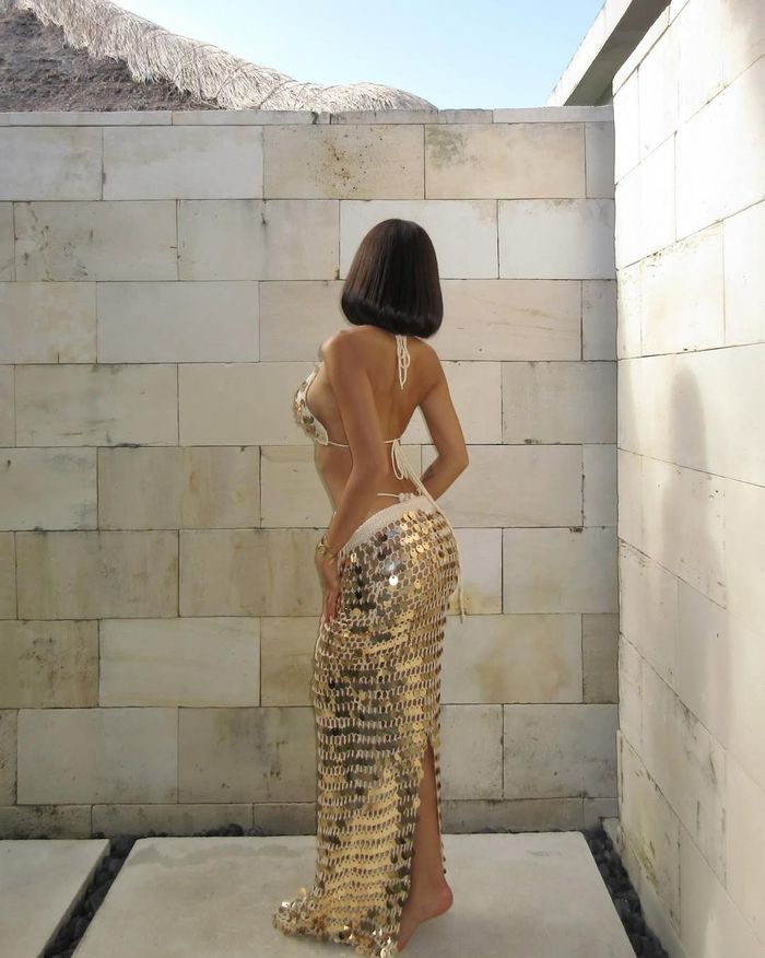 Thiết kế độc đáo này không chỉ giúp Huyền 2k4 khoe trọn vòng eo thon gọn và đường cong cơ thể mềm mại mà còn tạo hiệu ứng bắt sáng tuyệt đẹp dưới ánh nắng Bali.