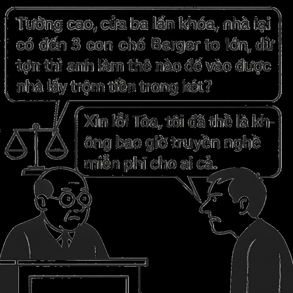 Chủ tọa phiên tòa hỏi bị cáo: — Tường cao, cửa ba lần khóa, nhà lại có đến 3 con chó Berger to lớn, dữ tợn thì anh làm thế nào để vào được nhà lấy trộm tiền trong két?