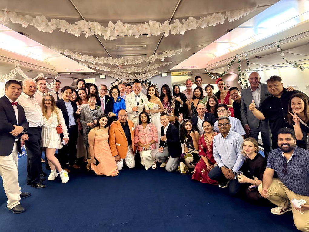 Cô dâu chú rể chụp ảnh cùng hơn 60 khách mời trên máy bay.