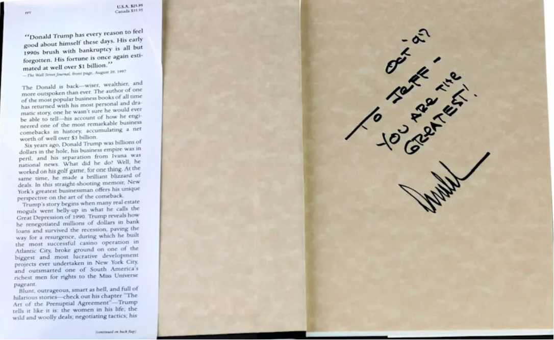 Tổng thống đã tặng Epstein cuốn sách Trump: Nghệ thuật Trở lại với dòng chữ khắc cá nhân, "Gửi Jeff - Anh là người Tuyệt Vời Nhất!", tờ New York Times đưa tin.