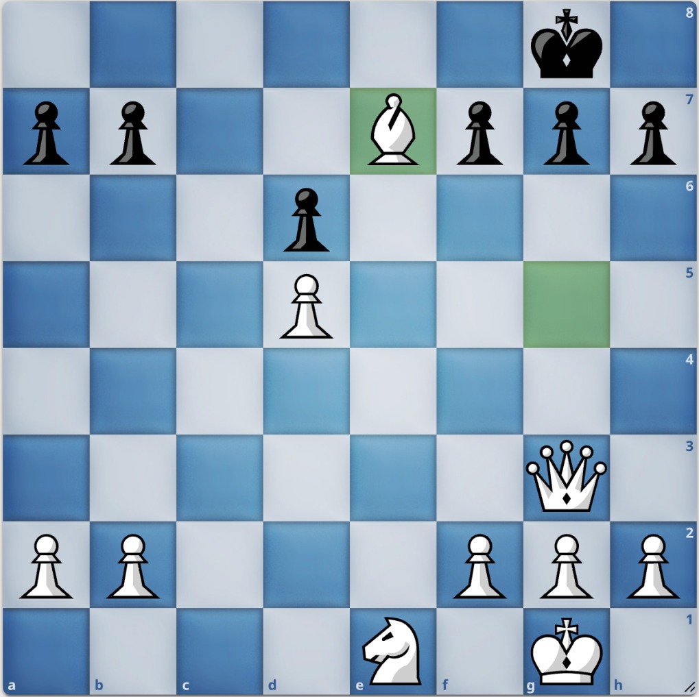 Hơn nữa, nước cờ của AI sai lầm nghiêm trọng, vì hậu trắng có thể lên a4 chiếu bắt mã. Mã đen lúc này không thể về c6 được, vì tốt trắng d5 sẽ bắt mã. Do lợi một mã, Praggnanandhaa đạt ưu thế thắng từ sớm.